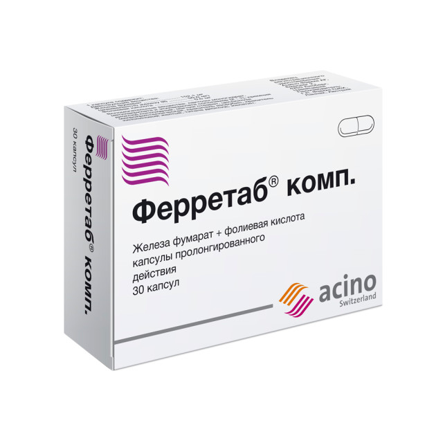 железа фумарат 163.56 мг, эквивалентно 152.1 мг сухого вещества, эквивалентно содержанию железа 50 мг, фолиевая кислота (вит. Bc) 0.54 мг, эквивалентно 0.5 мг сухого вещества Вспомогательные вещества: минитаблетки железа фумарата: лактозы моногидрат - 3.42 мг, кремния диоксид коллоидный - 0.6 мг, магния стеарат - 0.6 мг, сополимер метилметакрилата и этилакрилата [2:1] - 4.66 мг; минитаблетка фолиевой кислоты: лактозы моногидрат - 24.21 мг, целлюлоза микрокристаллическая - 24.25 мг, кремния диоксид коллоидный - 0.5 мг, магния стеарат - 0.5 мг.