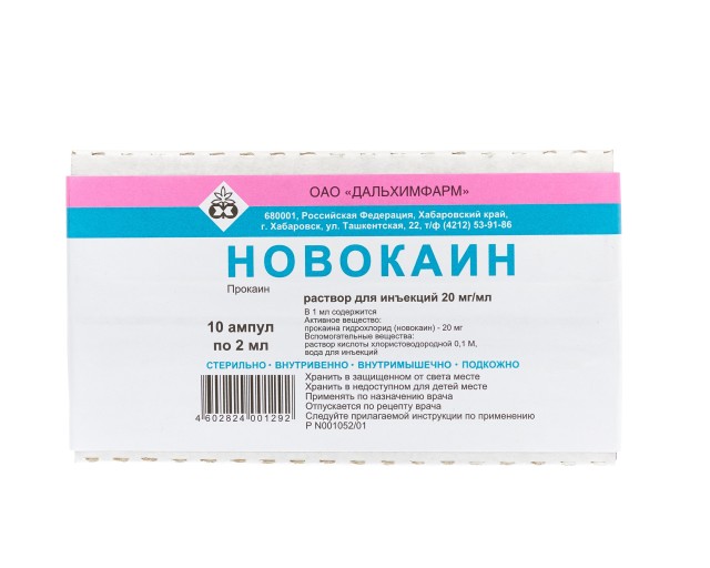 - инфильтрационная анестезия - 0,25-0,5% растворы - тугая ползучая инфильтрация - 0,125-0,25% растворы - проводниковая анестезия - 1-2% растворы - перидуральная анестезия - 2% раствор (20-25мл) - спинномозговая анестезия - 5% раствор (2-3мл) Для циркулярной и паравертебральной блокаде при экземах, нейродермите, радикулите и др. применяют внутрикожные инъекции 0,25-0,5% раствора. Для анестезии слизистых оболочек применяют 10-20% растворы новокаина. При паранефральной блокаде вводят по 50-80мл 0,5% раствора или 100-150мл 0,25% раствора новокаина, при вагосимпатической блокаде по 30-100мл 0,25% раствора. При мерцательной аритмии в/в 0,25% раствор по 2-5 мл до 4-5мл. При местной анестезии концентрация раствора новокаина определяется индивидуально. Для устранения болевого синдрома применяют в/м, в/в. В вену вводят 0,25-0,5% растворы от 1 до 10-15мл. При гипертонической болезни, атеросклерозе, спазмах коронарных сосудов и сосудов мозга в/м вводят 2% раствор по 5мл 3 раза в неделю, курс - 12 инъекций. Для инфильтрационной анестезии высшие разовые дозы (для взрослых): Первая разовая доза в начале операции - не выше 1,25г (500мл 0,25% раствора) и 0,75г (150мл 0,5% раствора). В дальнейшем на протяжении каждого часа операции - не выше 2,5г (1000мл 0,25% раствора) и 2г (400мл 0,5% раствора). Высшие разовые дозы при введении в мышцы 2% раствор - 0,1г (5мл), при введении в вену 0,25% раствор - 0,05г (20мл). Высшая суточная доза при введении в мышцы и вену - 0,1г.