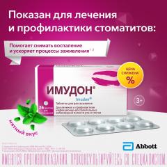 Применение при беременности и кормлении грудью: информация об использовании препарата при беременности недостаточна. Соответствующие данные экспериментов на животных и эпидемиологические исследования отсутствуют. Не рекомендуется принимать при беременности и в период лактации (грудного вскармливания). Полоскать рот и употреблять пищу можно не ранее чем через 1 ч после приема (чтобы не снижать активность). При назначении пациентам, соблюдающим бессолевую или малосолевую диету, необходимо учитывать, что 1 табл. Имудона содержит 15 мг натрия. Дети от 3 до 6 лет рассасывают таблетки в полости рта под наблюдением взрослого человека.