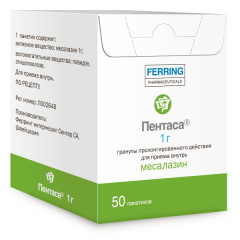 - всасывание: при пероральном применении гранулы Пентаса® распадаются на микрогранулы, действующие как самостоятельные формы препарата с замедленным высвобождением. Это обеспечивает терапевтический эффект препарата Пентаса® на всем протяжении от двенадцатиперстной кишки до прямой кишки при любых значениях pH. Микрогранулы достигают двенадцатиперстной кишки в течение часа после приема препарата. Время прохождения препарата через тонкую кишку в среднем составляет 3-4 часа.