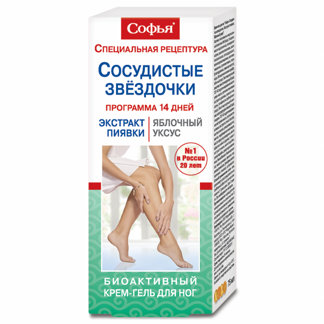 Софья сосудистые звездочки крем-гель для ног экстракт пиявки/яблочный уксус - специальное средство для устранения косметических проявлений в виде "звездочек" и "сеточек".