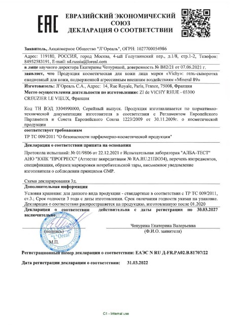 Первый* гель-сыворотка с рекордной концентрацией Минерализирующей Термальной воды Vichy [89%] и Гиалуроновой кислотой в высокой концентрации.