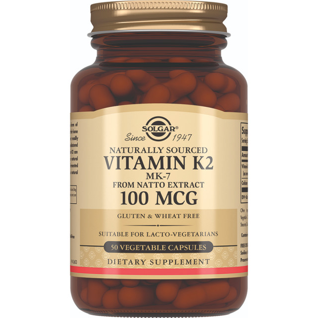 «Натуральный витамин К2 (менахинон 7) 100 мкг» рекомендуется в качестве биологически активной добавки к пище - дополнительного источника витамина К2, содержащей кальций. «Натуральный витамин К2 (менахинон 7) 100 мкг» от Солгар – это активная форма витамина К2 в виде менахинона с высоким уровнем биодоступности в оптимальной дозировке 100 мкг для восполнения суточной потребности организма. Витамин К2 — жирорастворимый витамин, необходимый организму для синтеза белков. Витамин К2 играет важную роль в обмене веществ, в укреплении костей и соединительной ткани, в работе почек, участвует в усвоении кальция и обеспечивает взаимодействие кальция и витамина D. Витамин К2 необходим для функционирования мышц, кальцификации костей (способствует их формированию и восстановлению), для профилактики остеопороза.