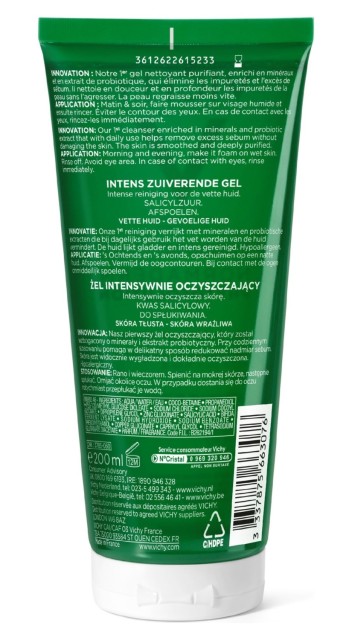 1-й* интенсивно очищающий гель для проблемной кожи, обогащенный минералами и пробиотикам и, на ежедневной основе уменьшающий жирность кожи без пересушивания и защищающий её от появления несовершенств. Эффективная комбинация активных ингредиентов: [Салициловая кислота]: обладает антибактериальным действием + [Пробиотик Bifidus]: восстанавливает защитный барьер кожи + [Олигоэлементы]: борются с воспалениями и регулируют выработку себума + [Минерализирующая термальная вода]: укрепляет и защищает кожу. Кожа чистая и свежая, без чувства стянутости. Для проблемной кожи, склонной к жирности. Подходит для чувствительной кожи. Гипоаллергенно. Некомедогенно. Без мыла и сульфатов. Не пересушивает кожу при частых умываниях. Предотвращает появление новых несовершенств. Не вызывает повышенное выделение себума. Физиологический pH 5.5. Очищающая основа растительного происхождения. Клинически доказанная эффективность**, протестированная под контролем дерматологов. -28% комедонов и чёрных точек. -18% воспалительных элементов. -17% гиперсебореи. C 1-го применения поры заметно уменьшены.