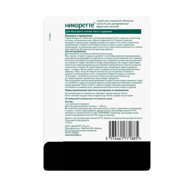 Спрей Никоретте® содержит малое количество этанола (спирт) – менее 10 мг на дозу.