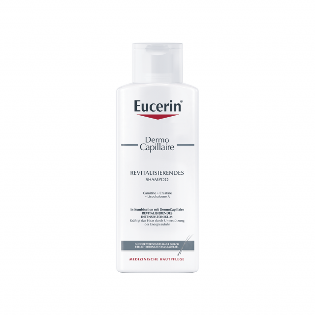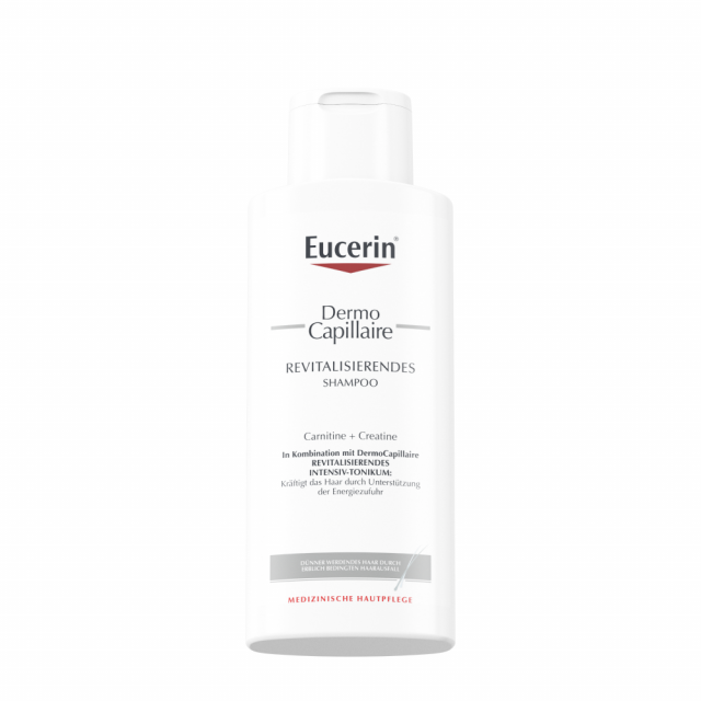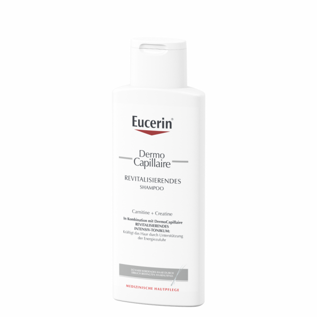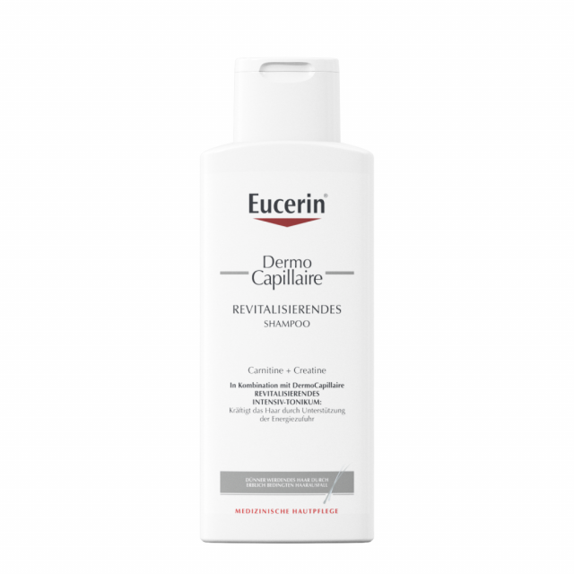 Шампунь против выпадения волос Eucerin DermoCapillaire создан для борьбы с генетически вызванным выпадением волос и их истончением. Входящие в состав шампуня карнитин и креатин способствуют укреплению корней волос.