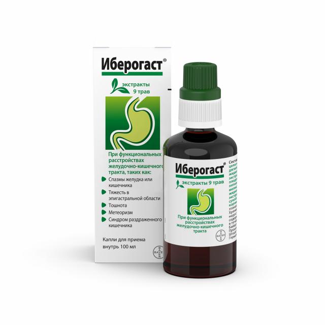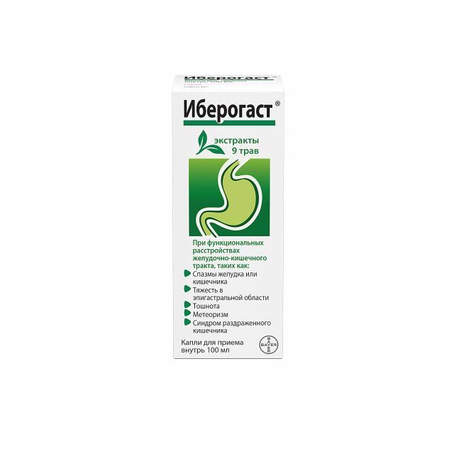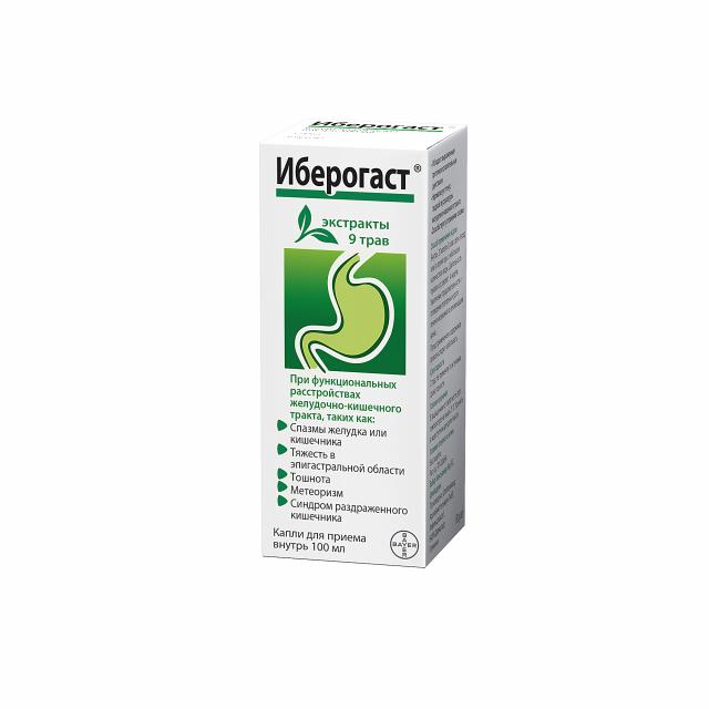 Препарат обладает выраженным противовоспалительным действием, а также нормализует тонус гладкой мускулатуры желудочно-кишечного тракта: способствует устранению спазма без влияния на нормальную перистальтику, а при пониженном тонусе и моторике оказывает тонизирующее, прокинетическое действие. В эксперименте in vitro ингибирует рост 6 подвидов Helicobacter pylori. Иберогаст® снижает интенсивность изъязвления слизистой оболочки желудка, секреции соляной кислоты, уменьшает концентрацию лейкотриенов, усиливает продукцию муцинов, повышает концентрацию мукопротективного простагландина Е2 в слизистой оболочке желудка.