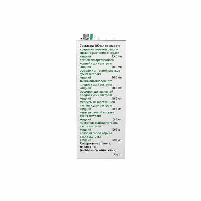 Содержание в составе препарата этилового спирта составляет от 29,5 до 32,6 % (по объему). При приеме 1 разовой дозы (20 капель) пациент получает до 0,24 г абсолютного этилового спирта. В максимальной суточной дозе препарата (60 капель) содержится до 0,72 г абсолютного этилового спирта. В процессе хранения возможно легкое помутнение или выпадение незначительного осадка, что не оказывает влияния на терапевтическую эффективность препарата.