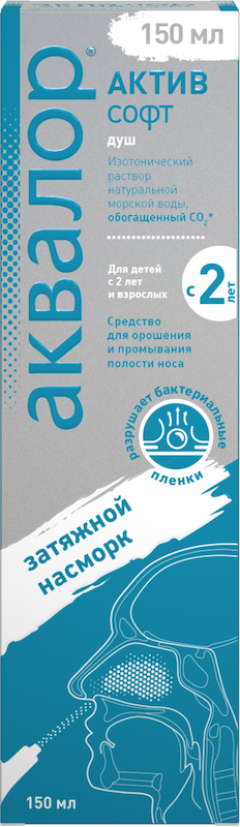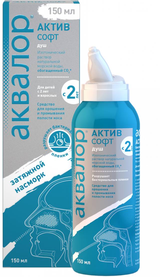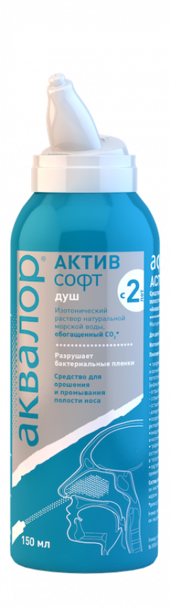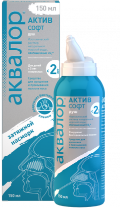 Аквалор Актив Софт — изотонический раствор морской воды, предназначенный для тщательного промывания полости носа, профилактики и лечения острого и хронического насморка у взрослых и детей с 2 лет. Средство обладает увлажняющим, иммуностимулирующим действием, которое обусловлено свойствами натуральной морской воды. Ее забор производится в экологически чистых районах Атлантического океана в территориальных водах Франции и Швеции. Специальная очистка и фильтрация позволяет сохранить в морской воде полезные микроэлементы и минералы.