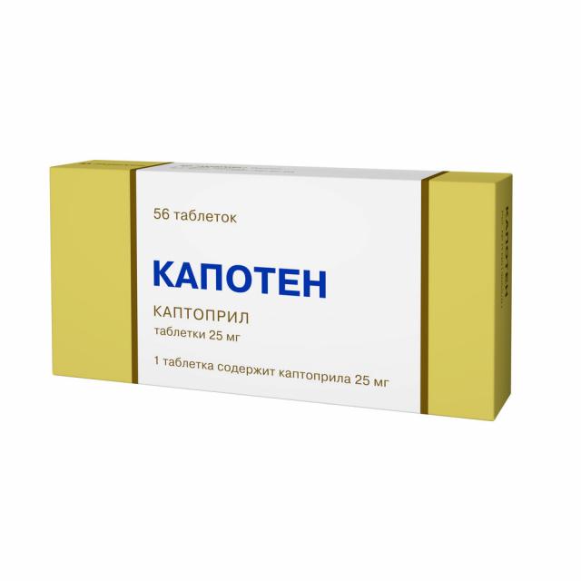 Фармакодинамика. Капотен является ингибитором ангиотензин - превращающего фермента (АПФ). Подавляет образование ангиотензина II и устраняет его сосудосуживающее действие на артериальные и венозные сосуды. Уменьшает общее периферическое сосудистое сопротивление, уменьшает постнагрузку, снижает артериальное давление. Уменьшает преднагрузку, снижает давление в правом предсердии и малом круге кровообращения. Уменьшает выделение альдостерона в надпочечниках. Фармакокинетика. При приеме внутрь биодоступность каптоприла составляет 60-70%. Одновременный прием пищи замедляет всасывание препарата на 30-40%. Связь с белками плазмы крови составляет 25-30 %. Период полувыведения 2-3 часа. Препарат выводится из организма преимущественно почками, до 50% в неизменном виде.