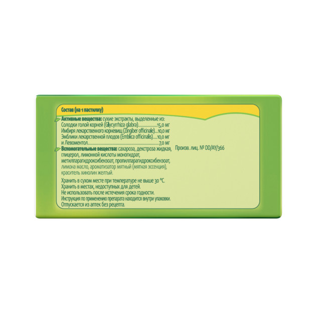 Комбинированный препарат растительного происхождения с противовоспалительным и отхаркивающим действием. Действие препарата обусловлено свойствами входящих в его состав компонентов. Экстракт корней солодки голой обладает противовоспалительным, отхаркивающим, спазмолитическим действием; экстракт корневища имбиря лекарственного оказывает противовоспалительное и болеутоляющее действие; экстракт эмблики лекарственной – противовоспалительное и жаропонижающее действие. Входящий в состав препарата ментол оказывает спазмолитическое, антисептическое действие.