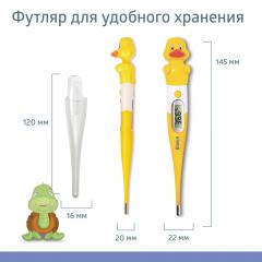 Дизайн термометра в виде веселого и яркого утенка обязательно понравится малышу и сделает измерение температуры проще.