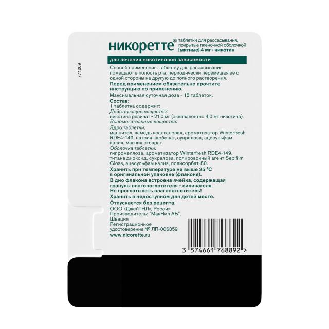 Первоначальная доза подбирается индивидуально, в зависимости от степени никотиновой зависимости пациента. Таблетки для рассасывания Никоретте® с содержанием никотина 4 мг рекомендуется применять тем, кто выкуривает 20 и более сигарет в день или выкуривает первую сигарету через 30 или менее минут после пробуждения. Остальным курильщикам следует начинать лечение с таблеток для рассасывания с содержанием никотина 2 мг.