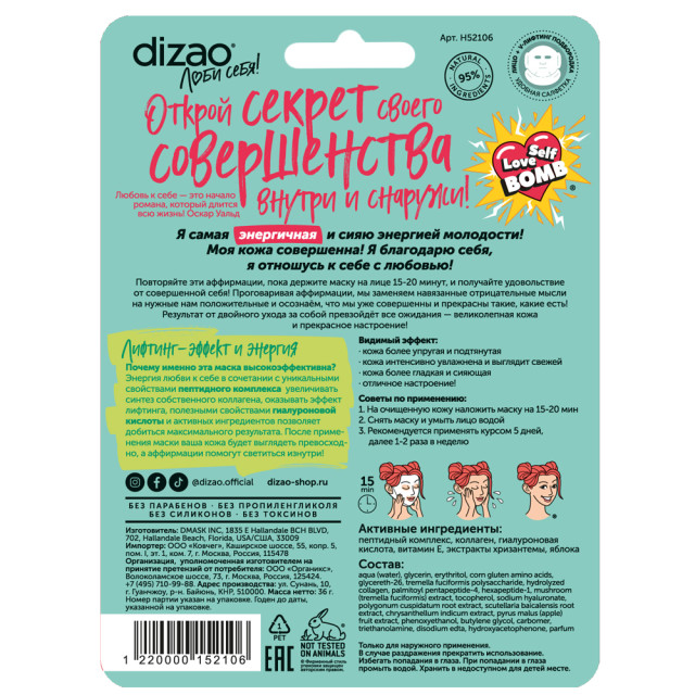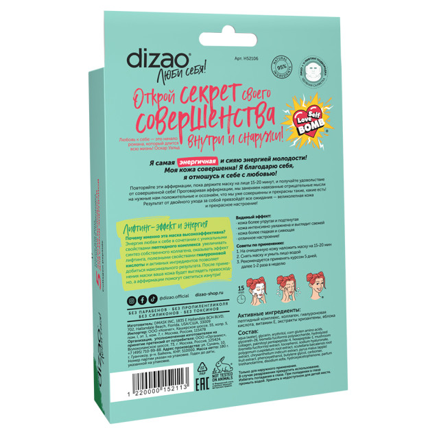 Энергия любви к себе в сочетании с уникальными свойствами пептидного комплекса увеличивать синтез собственного коллагена, оказывать эффект лифтинга, полезными свойствами гиалуроновой кислоты и активных ингредиентов в маске позволяет добиться максимального результата.
