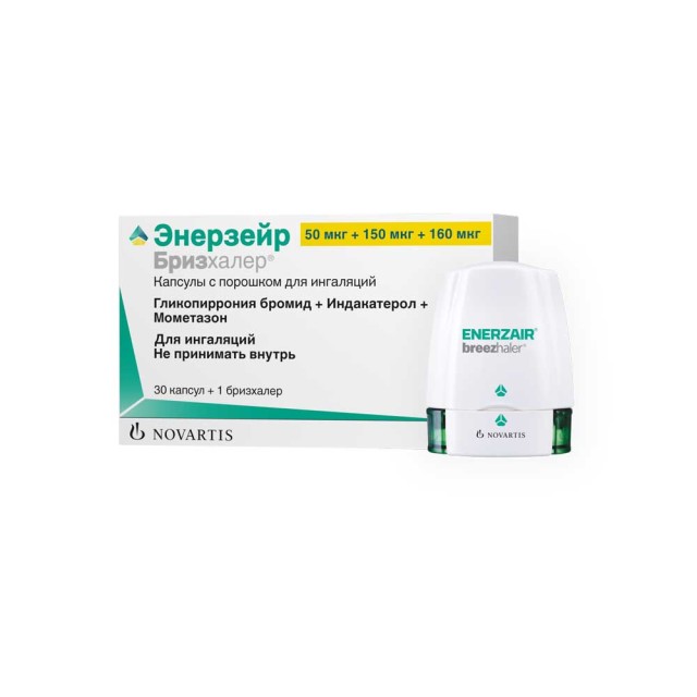 Препарат Энерзейр Бризхалер® является комбинацией индакатерола, длительно действующего бетаг-адреномиметика (ДДБА), гликопиррония, длительно действующего антихолинергического препарата (ДДАХ), и мометазона фуроата, ингаляционного синтетического глюкокортикостероида.