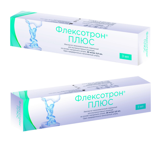 Имплантат вязкоэластичный стерильный для внутрисуставных инъекций ФЛЕКСОТРОН® Плюс (FLEXOTRON® Plus), на основе гиалуроната натрия, 20 мг/мл, 3 мл.