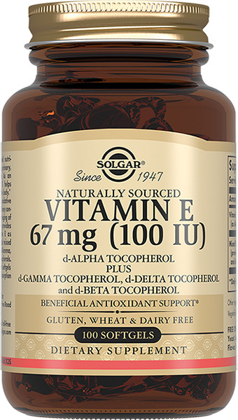 Капсулы «Витамин Е 100 МЕ» (Vitamin E 100 IU Soft gels) - содержит натуральный витамин Е, представленный в виде d-альфа токоферола, а так же смесь изомеров токоферола (d-бета, d-дельта, d- гамма), которые усиливают антиоксидантные свойства витамина Е.