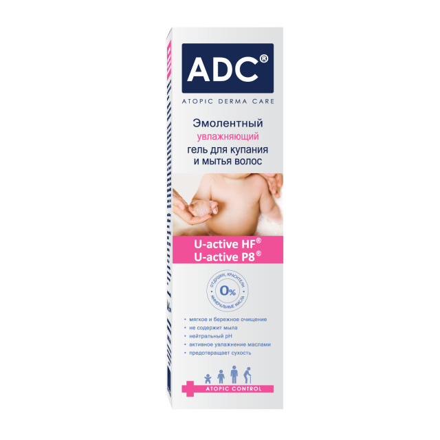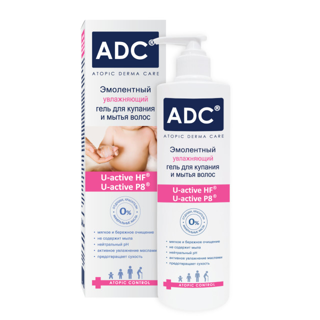 Эмолентный увлажняющий гель для купания и мытья волос серии «ADC®» для ежедневного ухода и бережного очищения атопичной, сухой и склонной к раздражению кожи у новорожденных, младенцев, детей и взрослых. Постоянное применение геля совместно с питательной гидрорегулирующей эмульсией позволяет значительно улучшить состояние кожи и снизить периодичность возможных атопических вспышек. Средство протестировано под контролем дерматологов и педиатров. Доказанная эффективность входящих в состав компонентов: U-active HF®