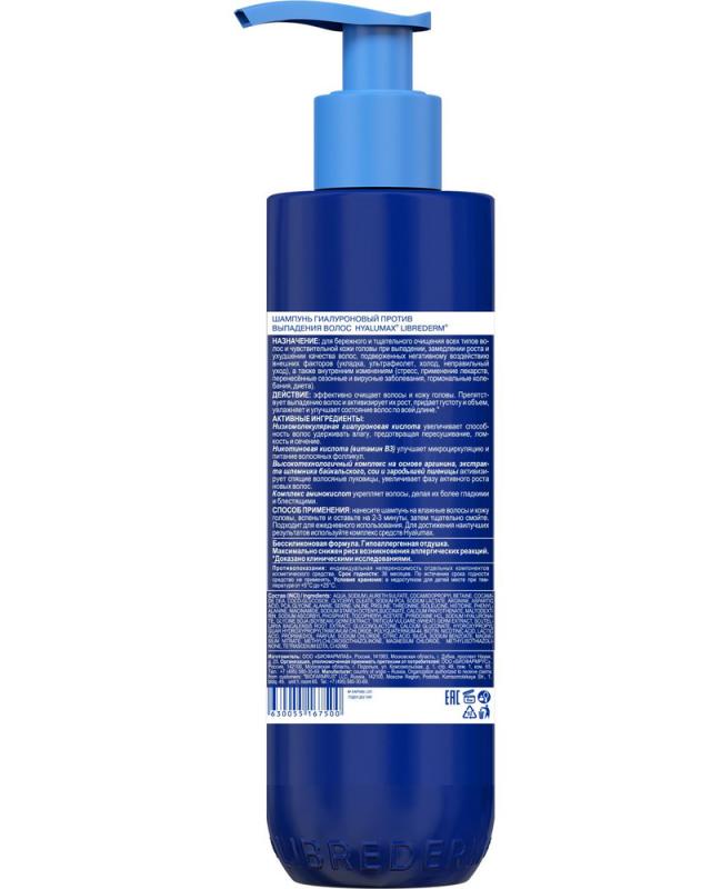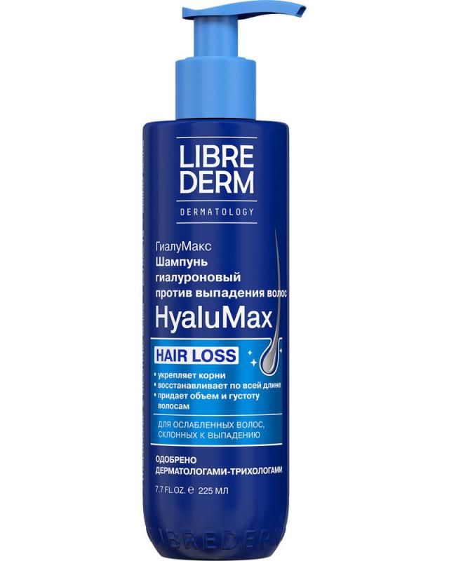 LIBREDERM HyaluMax Шампунь гиалуроновый против выпадения волос 225 мл. Шампунь для бережного и тщательного очищения всех типов волос и чувствительной кожи головы при выпадении, замедлении роста и ухудшении качества волос, подверженных негативному воздействию внешних факторов (укладка, ультрафиолет, холод, неправильный уход), а также внутренним изменениям (стресс, применение лекарств, перенесённые сезонные и вирусные заболевания, гормональные колебания, диета).