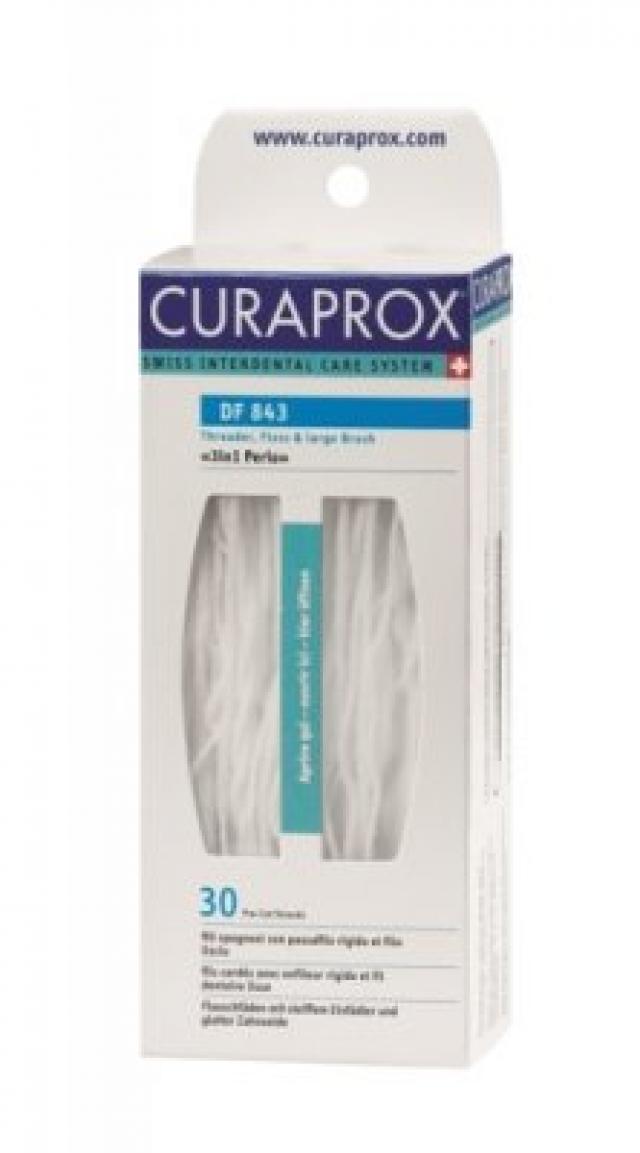 Межзубная нить Curaprox DF 843 изготовлена из нейлона. Преимущество нитей из нейлона заключается в том, что они намного прочнее большинства своих аналогов. Не уступают по прочности только нити из тефлона. Данная нить распределена на 3 зоны: с одной стороны твердая часть - держатель нити, затем идет губчатая часть и зубная нить. Нитедержатель помогает ввести нить в межзубной промежуток, а губчатая часть тщательно прочищает промежуток. В комплекте 30 штук.
