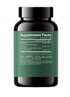Состав: гидроксид магния, оксид магния, микрокристаллическая целлюлоза (носитель), инулин, оксид цинка, диокисид кремния (агент антислеживающий), магниевые соли стеариновой кислоты (агент антислеживающий), орто-Фосфат кальция 3-замещенный (агент антислеживающий), малат магния, цитрат магния, пиридоксин гидрохлорид, гидроксипропилметилцеллюлоза (загуститель).