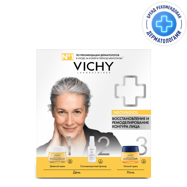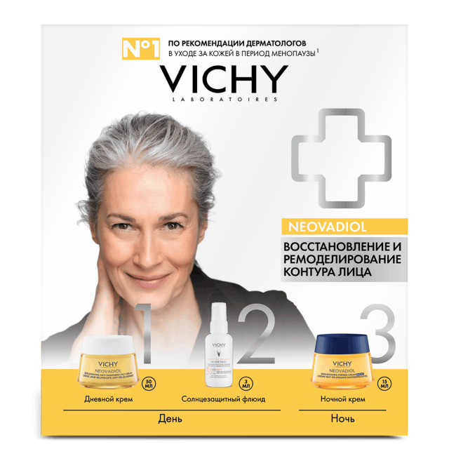 1. VICHY NEOVADIOL Крем дневной восстанавливающий и ремоделирующий контуры лица. Содержит активные ингредиенты, разглаживающие морщины, подтягивающие кожу, корректирующие и моделирующие овал лица. Средство предназначено для anti-age (анти-эйдж) ухода за зрелой кожей лица женщин при климаксе и менопаузе (категории 40, 45+, 50, 55 и 60 “плюс” лет с редкими исключениями)