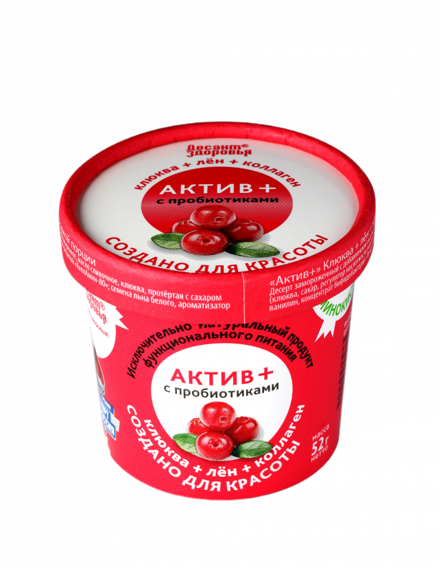 Вес 52 гр. Десерт ванильный замороженный с добавлением молока, обогащенный бифидобактериями, с коллагеном, льном и клюквой м.д.ж.7,5%, в бумажном стакане