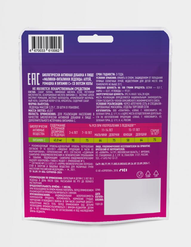 БИОЛОГИЧЕСКИ АКТИВНАЯ ДОБАВКА К ПИЩЕ «МАЛИНКИ-ВИТАЛИНКИ леденцы: алтей, ромашка и витамин С» со вкусом колы