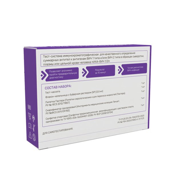 Предназначен для одноэтапного быстрого качественного определения суммарных антител (IgA ,IgM и IgG) к антигенам ВИЧ 1 типа и/или ВИЧ 2 типа в образцах сыворотки, плазмы, венозной или капиллярной крови человека методом иммунохроматографического анализа (ИХА) с целью первичной диагностики ВИЧ инфекции.