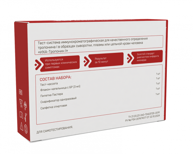 Предназначен для одноэтапного быстрого качественного определения сердечного тропонина I в образцах сыворотки, плазмы или цельной крови человека методом иммунохроматографического анализа (ИХА) с целью первичной диагностики инфаркта миокарда.