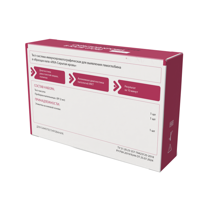 Предназначен для одноэтапного быстрого качественного выявления гемоглобина (скрытой крови) в образцах кала человека методом иммунохроматографического анализа (ИХА) с целью первичной диагностики патологии нижних отделов желудочно-кишечного тракта.