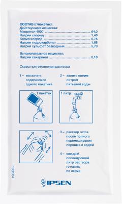 Каждый пакетик порошка содержит 64,00 грамм макрогола 4000, 1,46 грамм натрия хлорида, 0,75 грамм калия хлорида, 1,68 грамм натрия гидрокарбоната, 5,70 грамм натрия сульфата безводного.