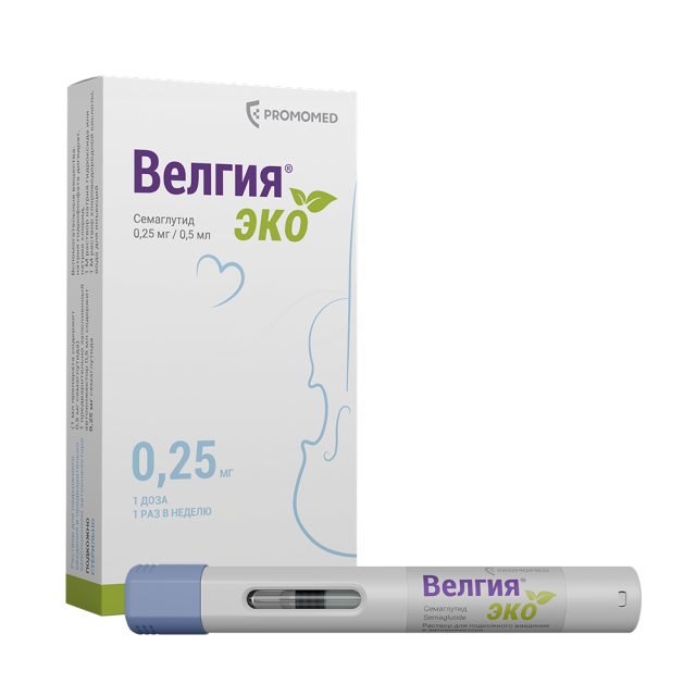 Велгия® эко – это препарат, содержащий действующее вещество семаглутид, который назначается в качестве дополнения к низкокалорийной диете и физической активности для коррекции и контроля массы тела. Семаглутид относится к группе лекарственных средств: средства для лечения сахарного диабета; гипогликемические средства, кроме инсулинов. Семаглутид является аналогом природного гормона – глюкагоноподобного пептида-1 (ГПП-1), который выделяется после приема пищи и служит физиологическим регулятором углеводного обмена (уровня инсулина и глюкозы), а также аппетита и потребления пищи. Семаглутид воздействует на мишени (рецепторы) в головном мозге, которые контролируют аппетит, что помогает Вам быстрее почувствовать себя сытым, сохранить это ощущение надолго и снизить повышенную тягу к приему пищи. Также семаглутид затормаживает эвакуацию пищи из желудка, что дополнительно поддерживает длительное ощущение сытости. Такой механизм поможет Вам привыкнуть к правильному питанию и эффективно снизить массу тела. При приеме семаглутида наблюдаются дополнительные эффекты, такие как уменьшение окружности талии, улучшение обмена веществ (уровня липидов, глюкозы и др.), улучшение параметров сердечно-сосудистой системы (артериальное давление, пульс). Снижение массы тела на фоне приема семаглутида способствует уменьшению риска развития осложнений, связанных с наличием повышенной массы тела, в частности, сердечно-сосудистых заболеваний, сахарного диабета 2 типа (СД2), репродуктивных нарушений, заболеваний суставов, печени и др.