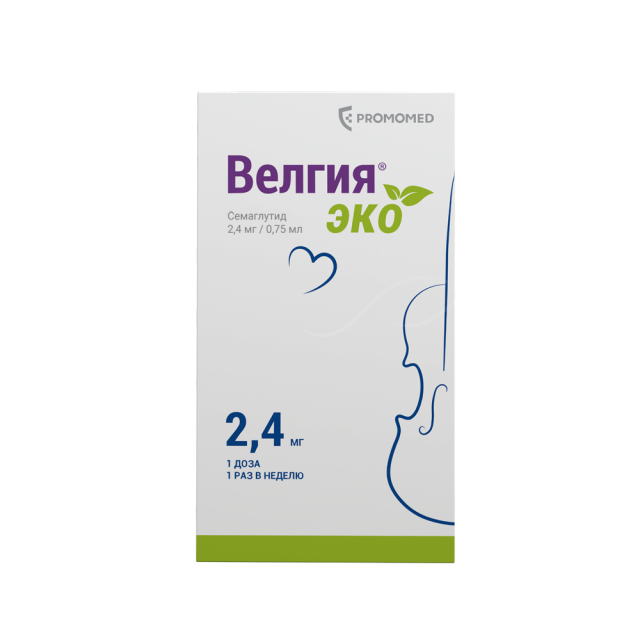 Велгия® эко – это препарат, содержащий действующее вещество семаглутид, который назначается в качестве дополнения к низкокалорийной диете и физической активности для коррекции и контроля массы тела. Семаглутид относится к группе лекарственных средств: средства для лечения сахарного диабета; гипогликемические средства, кроме инсулинов. Семаглутид является аналогом природного гормона – глюкагоноподобного пептида-1 (ГПП-1), который выделяется после приема пищи и служит физиологическим регулятором углеводного обмена (уровня инсулина и глюкозы), а также аппетита и потребления пищи. Семаглутид воздействует на мишени (рецепторы) в головном мозге, которые контролируют аппетит, что помогает Вам быстрее почувствовать себя сытым, сохранить это ощущение надолго и снизить повышенную тягу к приему пищи. Также семаглутид затормаживает эвакуацию пищи из желудка, что дополнительно поддерживает длительное ощущение сытости. Такой механизм поможет Вам привыкнуть к правильному питанию и эффективно снизить массу тела. При приеме семаглутида наблюдаются дополнительные эффекты, такие как уменьшение окружности талии, улучшение обмена веществ (уровня липидов, глюкозы и др.), улучшение параметров сердечно-сосудистой системы (артериальное давление, пульс). Снижение массы тела на фоне приема семаглутида способствует уменьшению риска развития осложнений, связанных с наличием повышенной массы тела, в частности, сердечно-сосудистых заболеваний, сахарного диабета 2 типа (СД2), репродуктивных нарушений, заболеваний суставов, печени и др.