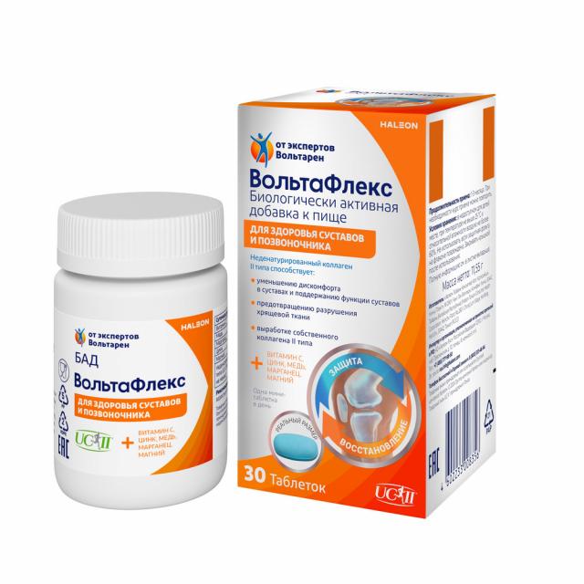 Коллаген II типа UC-II® в составе БАДа ВольтаФлекс способствует уменьшению дискомфорта в суставах и поддержанию функции суставов, предотвращению разрушения суставных хрящей, выработке собственного коллагена II типа, улучшению двигательной активности и выносливости при физических нагрузках.