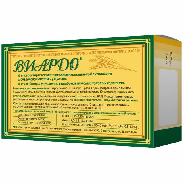 Маслозародышей пшеницы Виардо капсулы по 60 или 100 шт. в упаковке. 1 капсула Виардо содержит: витамин Е 600 мкг, витамин А 60 мкг, витамин D 5мкг, витамин В5 48 мкг, фолиевая кислота 9 мкг, а также необходимые жирные кислоты: линоленовая 45 мг, линолевая 120 мг, олеиновая 48 мг, пальметиновая 600 мкг, арахидоновая 9 мкг.